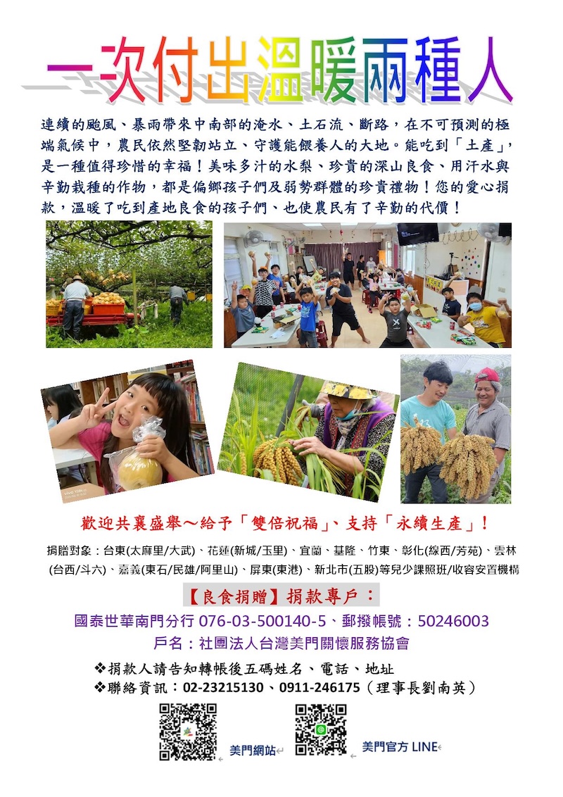 • 照片說明文字此為美門協會發起的「良食捐贈」。愛心捐款向農民購買他們所栽種生產的產品(如東勢水梨、茶山良食),捐贈給偏鄉辦理弱勢兒少課照班的教會做為食材或送給孩子們吃,這樣捐款一方面支持辛苦的農民,又使弱勢兒少可以吃到產地新鮮良食,使捐款一舉二得,發揮雙倍效益喔!